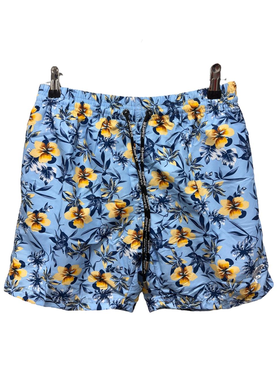 Pantaloneta para hombre con base azul claro y estampado de flores amarillas y hojas azules.