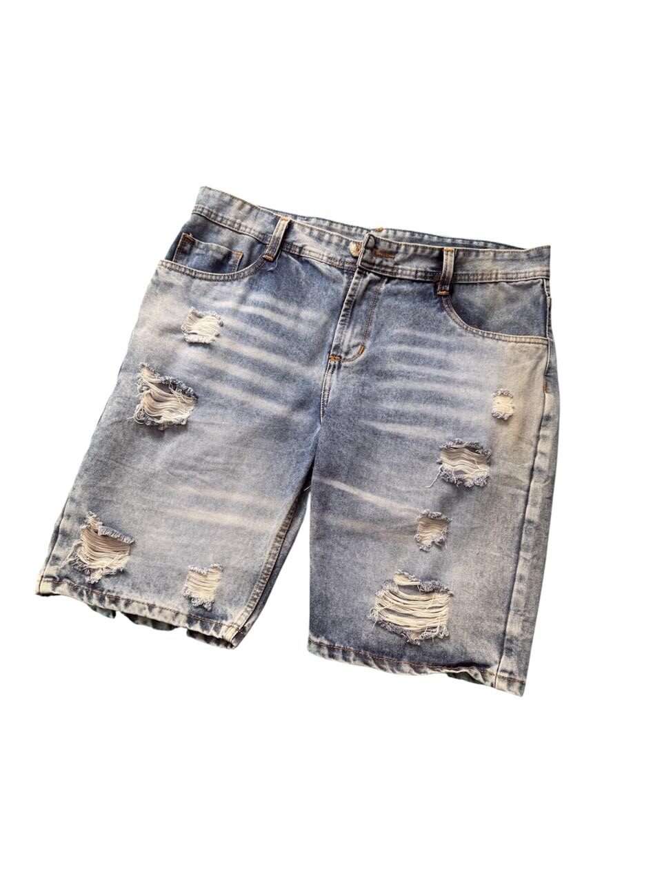 Short denim azul claro con efecto deslavado y rasgados marcados: